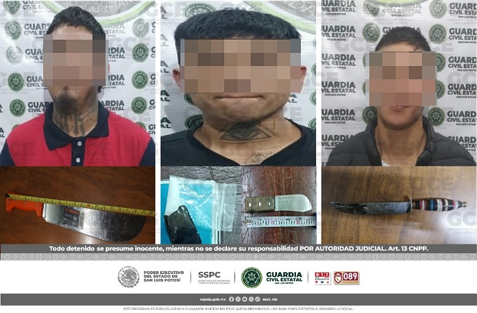 San Luis Potosí, S.L.P.- Mediante los operativos de seguridad y vigilancia, desarrollados en la capital potosina, elementos de la Guardia Civil Estatal (GCE) detuvieron a tres hombres, en diferentes ubicaciones, por el probable delito de portación de armas prohibidas.