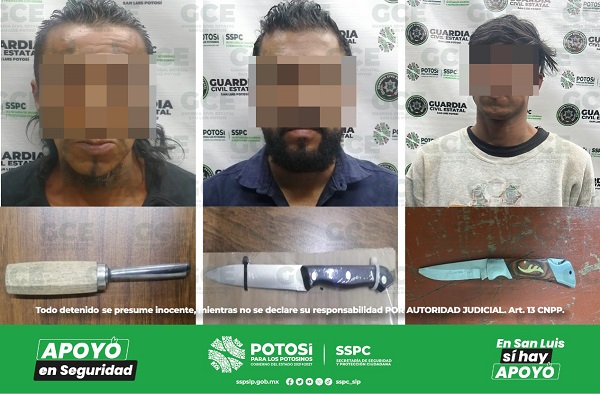 San Luis Potosí, S.L.P.- En la zona metropolitana, agentes de la Guardia Civil Estatal (GCE), detuvieron a tres hombres después de que se les aseguraran armas punzocortantes que llevaban consigo.