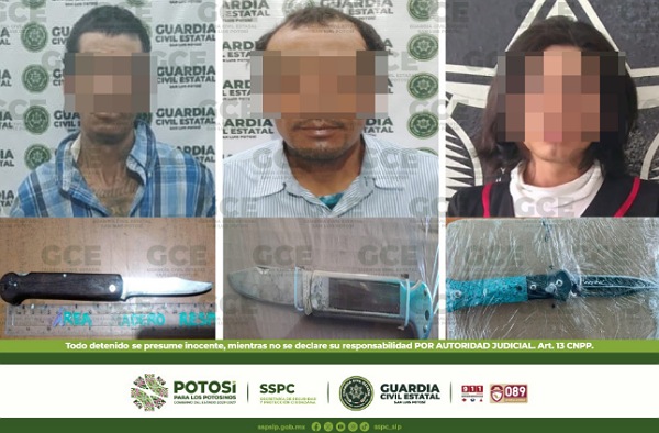 S.L.P.- Patrullajes preventivos efectuados las cuatro regiones del Estado, permitieron la detención de tres hombres, luego de que agentes de la Guardia Civil Estatal (GCE), los sorprendieran con probables armas punzocortantes.