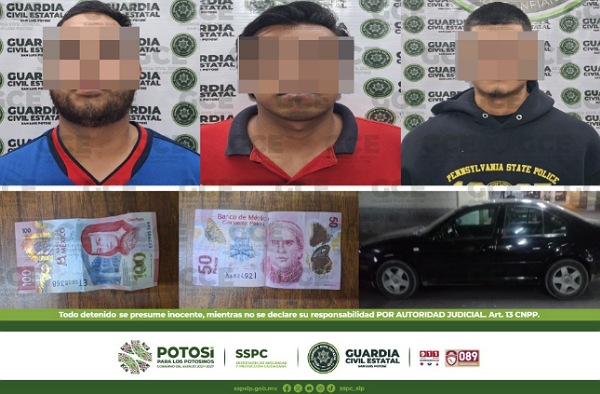 San Luis Potosí, S.L.P.- Como resultado de los trabajos operativos, efectuados en la colonia Punta del Valle, agentes de la Guardia Civil Estatal (GCE) detuvieron a tres hombres, quienes presumiblemente fueron señalados de atentar contra la seguridad vial, además de intentar evadir su responsabilidad legal y ofrecer dinero en efectivo a los elementos aprehensores.