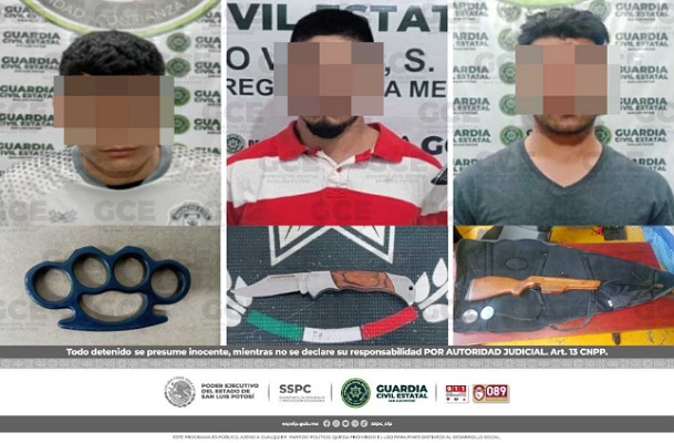 San Luis Potosí, S.L.P.- Mediante los patrullajes preventivos y de vigilancia, desarrollados por policías de la Guardia Civil Estatal (GCE), tres hombres fueron detenidos por el probable delito de portación de armas prohibidas.