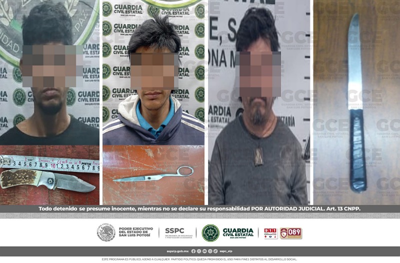 Tres de los sucesos ocurrieron en la zona metropolitana: el primero detenido se ubicó en la colonia San Juan de Guadalupe, se trata de un joven de 15 años de edad, sorprendido con un cuchillo de 15 centímetros; mientras que en la colonia Morales, Erlin “N” de 37 años, quedó detenido con una navaja; al igual que Ricardo “N” de 29 años, detenido en la colonia Las Trancas con una hoja de tijera, de 17 centímetros. Por último, en el municipio de Rioverde, policías de la GCE detuvieron a Baltasar “N” de 47 años de edad, en la colonia María Asunción, luego de asegurarle un cuchillo de metal entre sus pertenencias.