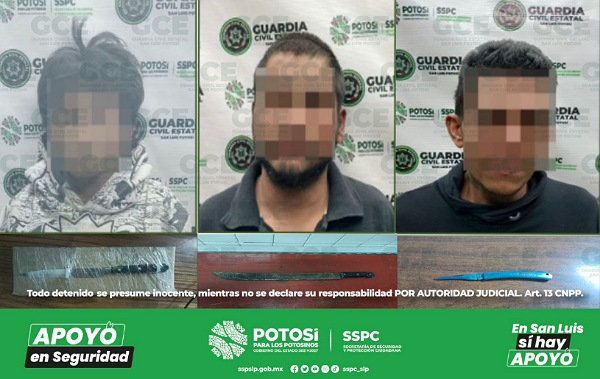 San Luis Potosí, S.L.P.- Labores de seguridad y vigilancia desarrolladas en los diferentes puntos de la zona metropolitana por la Guardia Civil Estatal (GCE), permitieron la detención de tres masculinos y un menor de edad, por presunta portación de armas punzocortantes.