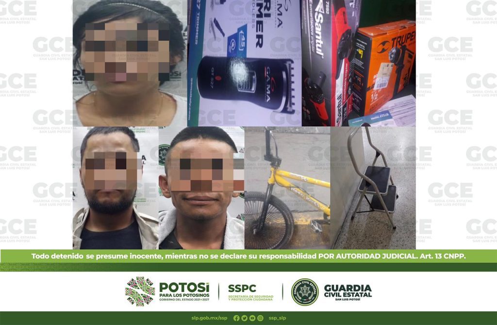 S.L.P.- En distintas acciones, oficiales de Guardia Civil Estatal (GCE) detuvieron a tres hombres y una mujer, señalados del probable delito de robo a comercios ubicados en la capital potosina y en el municipio de Soledad de Graciano Sánchez; resultado de estas remisiones fue mediante las denuncias de la ciudadanía en el Sistema de Emergencias 911.