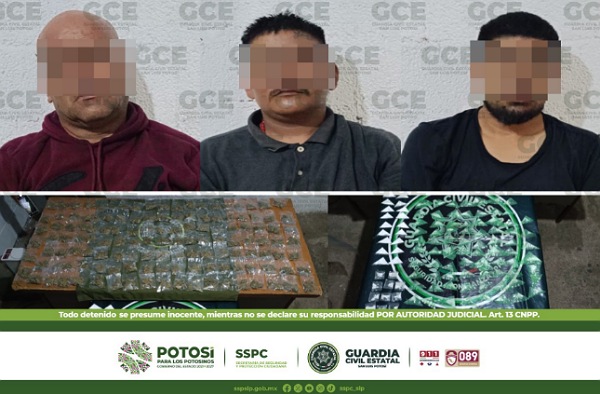 Tamasopo, S.L.P.- Mediante el combate sin tregua a la delincuencia, agentes de la Guardia Civil Estatal en coordinación con el Ejército Mexicano y Guardia Nacional, realizaron un importante aseguramiento de más de 200 narcóticos en la delegación de Tambaca y donde tres presuntos miembros de la delincuencia fueron detenidos.