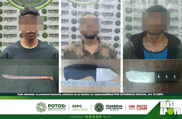 San Luis Potosí, S.L.P.- Policías de la Guardia Civil Estatal (GCE), detuvieron a tres personas, por el probable delito de portación de armas blancas, derivado de los trabajos preventivos efectuados en la entidad.