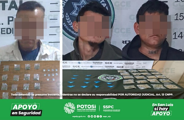 S.L.P.- La aplicación del Plan Integral de Seguridad por elementos de la Guardia Civil Estatal (GCE) en los municipios de Cárdenas y Charcas, permitió la detención de tres presuntos vendedores de narcóticos; uno de ellos probable miembro de una red delictiva generadora de violencia.