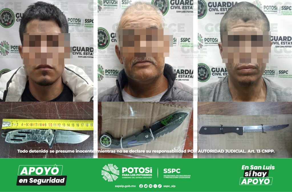San Luis Potosí, S.L.P.- Derivado de las acciones dispuestas para salvaguardar la integridad de las familias potosinas, en diferentes acciones agentes de la Guardia Civil Estatal (GCE) detuvieron a tres presuntos por el probable delito de portación de armas prohibidas.
