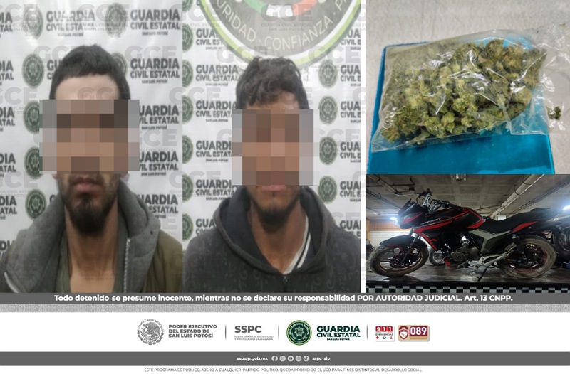 Una de las acciones ocurrió en la comunidad La Barranca, perteneciente a Soledad de Graciano Sánchez, elementos estatales detectaron a los tripulantes de una motocicleta que no portaba placa ni permiso para circulación, por ello les indicaron que se detuvieran, metros más adelante.