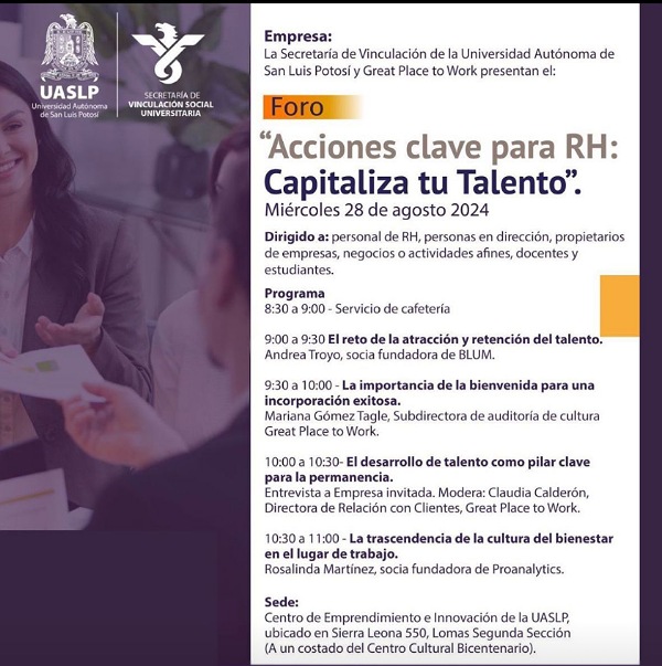 La Secretaría de Vinculación Social Universitaria de la Universidad Autónoma de San Luis Potosí (UASLP), en colaboración con la empresa certificadora Great Place to Work (GTPWR), llevará a cabo el próximo miércoles 28 de agosto de 2024 el foro “Acciones clave para RH: capitaliza tu talento”, en el Centro de Emprendimiento e Innovación Potosino (CEIP), situado en Sierra Leona no. 550, Lomas Segunda Sección,