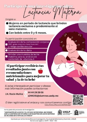 Las interesadas en formar parte de esta investigación, pueden regístrarse en el siguiente enlace https://forms.office.com/r/3hHfq5mwwY o comunicarse directamente con la L.N. Rocío Muñoz al número: 4444292808.