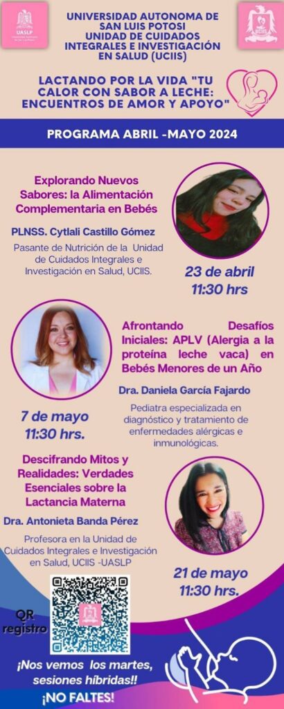 Como parte de las acciones de vinculación social que mantiene la Universidad Autónoma de San Luis Potosí (UASLP), la Facultad de Enfermería y Nutrición (FEN) a través de la Unidad de Cuidados Integrales e Investigación en Salud (UCIIS) y con el lema Lactando por la vida “Tu calor con sabor a leche: encuentros de amor y apoyo”, invita a madres lactantes y futuras mamás a su programa de apoyo a la lactancia materna, que tendrá sesiones gratuitas de manera híbrida durante abril y mayo de 2024.