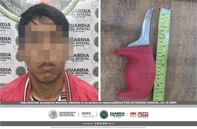 San Luis Potosí, S.L.P.- Como parte de la aplicación del Plan Integral de Seguridad en las cuatro regiones del Estado, elementos de la Guardia Civil Estatal aseguraron a un hombre que llevaba consigo un arma prohibida.