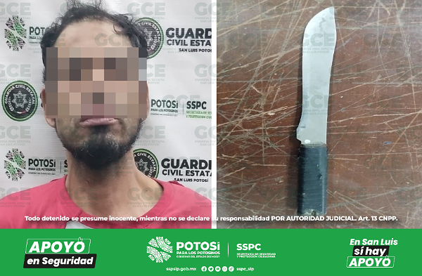 San Luis Potosí, S.L.P.- Como parte de la aplicación del Plan Integral de Seguridad en las cuatro regiones del Estado, elementos de la Guardia Civil Estatal aseguraron a un hombre que llevaba consigo un arma prohibida.