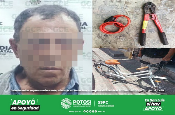 El presunto se ubicó en la zona centro de la capital potosina, en las calles de Iturbide y 5 de Mayo, deambulaba con la bicicleta de la afectada, por ello se procedió a la detención de Ricardo “N” de 65 años de edad, a quien se le aseguró además un par de cizallas y un candado.