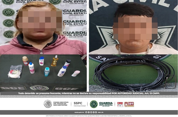 S.L.P.- En distintas acciones, elementos de la Guardia Civil Estatal, aseguraron a un hombre y a una mujer acusados de cometer robo. A uno de los detenidos se le aseguró cableado y varilla mientras que a la presunta se le decomisó mercancía.