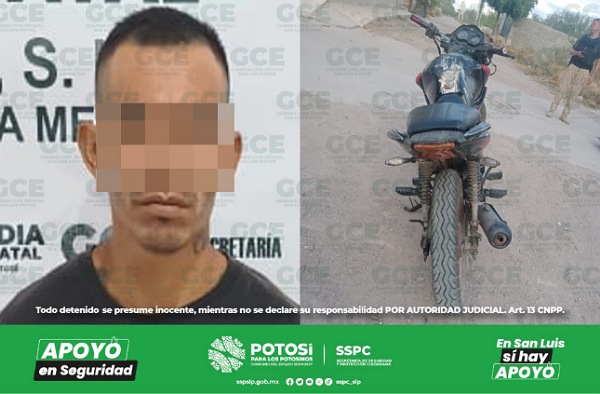 Rioverde, S.L.P.- Agentes de la Guardia Civil Estatal (GCE) detectaron a un motociclista en la zona centro de Rioverde, quien presumiblemente manejaba bajo los influjos de sustancias nocivas para la salud, al notar que su conducir era errático y exponía tanto su integridad como la de otras personas, lo que derivó en su detención.