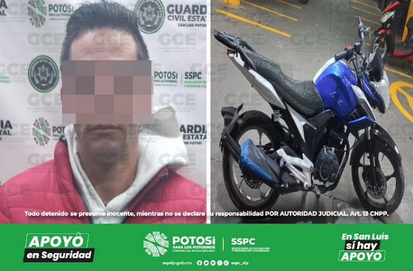 San Luis Potosí, S.L.P.- Labores preventivas efectuadas por la Guardia Civil Estatal (GCE) permitieron la detención de un motociclista, por el probable delito de circular en un vehículo con placa sobrepuesta.