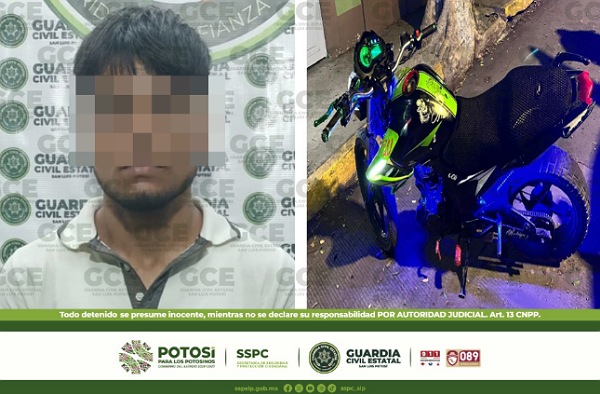 San Luis Potosí, S.L.P.- En el marco de las acciones de seguridad implementadas con el objetivo de inhibir actos constitutivos de delito, así como la detección de vehículos que cuenten con reporte de robo, agentes de la Guardia Civil Estatal recuperaron una motocicleta y detuvieron a su ocupante.