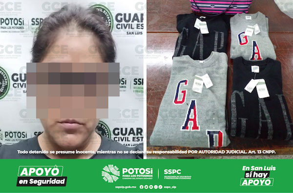San Luis Potosí, S.L.P.- Como parte de los dispositivos de seguridad y prevención que efectúan los elementos de la Guardia Civil Estatal en la zona metropolitana, se logró la detención de una mujer acusada del probable delito de robo.