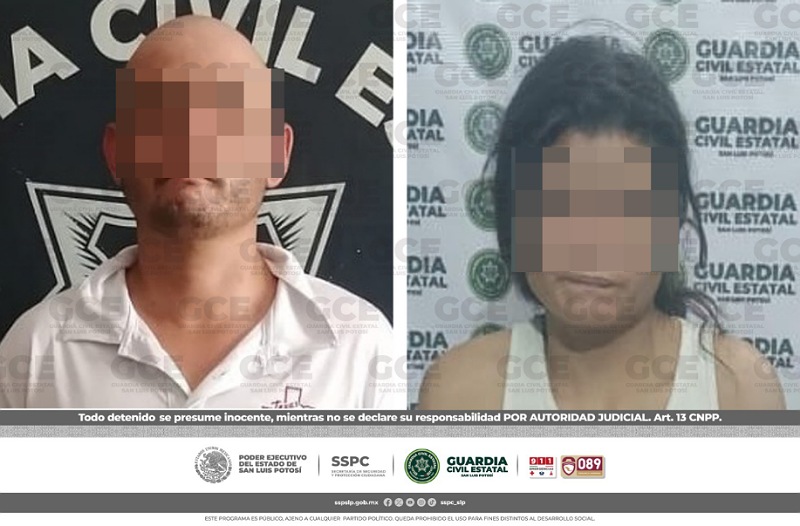 S.L.P.- Elementos de la Guardia Civil Estatal detuvieron a un hombre y a una mujer por la presunta comisión del delito de violencia familiar en distintas acciones en la capital potosina y en el municipio de Ciudad Valles.
