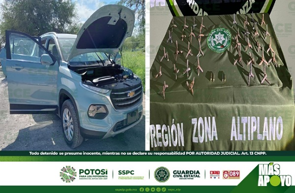 Cedral, S.L.P.- Derivado de los trabajos realizados en el operativo “Altiplano Seguro”, policías de la Guardia Civil Estatal (GCE), aseguraron un vehículo en aparente estado de abandono, con objetos prohibidos, conocidos como “poncha llantas” y con cuatro cartuchos útiles de diferentes calibres.