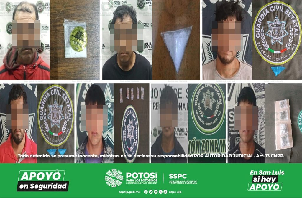 S.L.P.- Derivado de las tareas de vigilancia que desarrolla la Guardia Civil Estatal en las cuatro regiones de San Luis Potosí, 20 personas resultaron detenidas, luego de que presumiblemente fueran sorprendidas con dosis de estupefacientes en sus pertenencias.