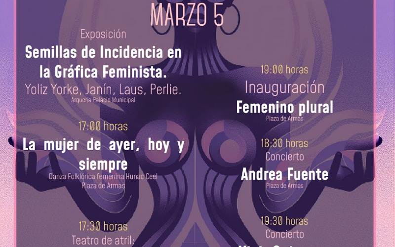 1. Exposición Semillas de Incidencia en la Gráfica Femenina, de las artistas Yoliz Yorke, Janín, Laus y Perlie. Se trata de una muestra de 16 imágenes que representan el concepto de semillar a través de la imagen, entendiendo el semillar como un acto de sembrar resiliencia y empoderamiento en las mujeres. Las obras reflejan las vivencias, luchas y sueños de las artistas, así como su visión crítica y creativa sobre la realidad que enfrentan las mujeres en el mundo. Vigencia al 15 de marzo en la arquería de Palacio Municipal.