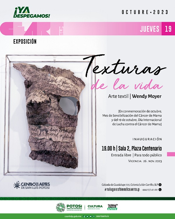 En San Luis Potosí si hay apoyo en cultura que impacte en la vida de todas las personas, por eso en conmemoración por el Día Internacional de la Lucha Contra el Cáncer de Mama, la Secretaría de Cultura de Gobierno del Estado, invita a la inauguración de la exposición “Texturas de vida”, de la artista norteamericana Wendy Moyer, que se llevará a cabo este jueves 19 de octubre, a las 19:00 h, en el Centro de las Artes SLP.